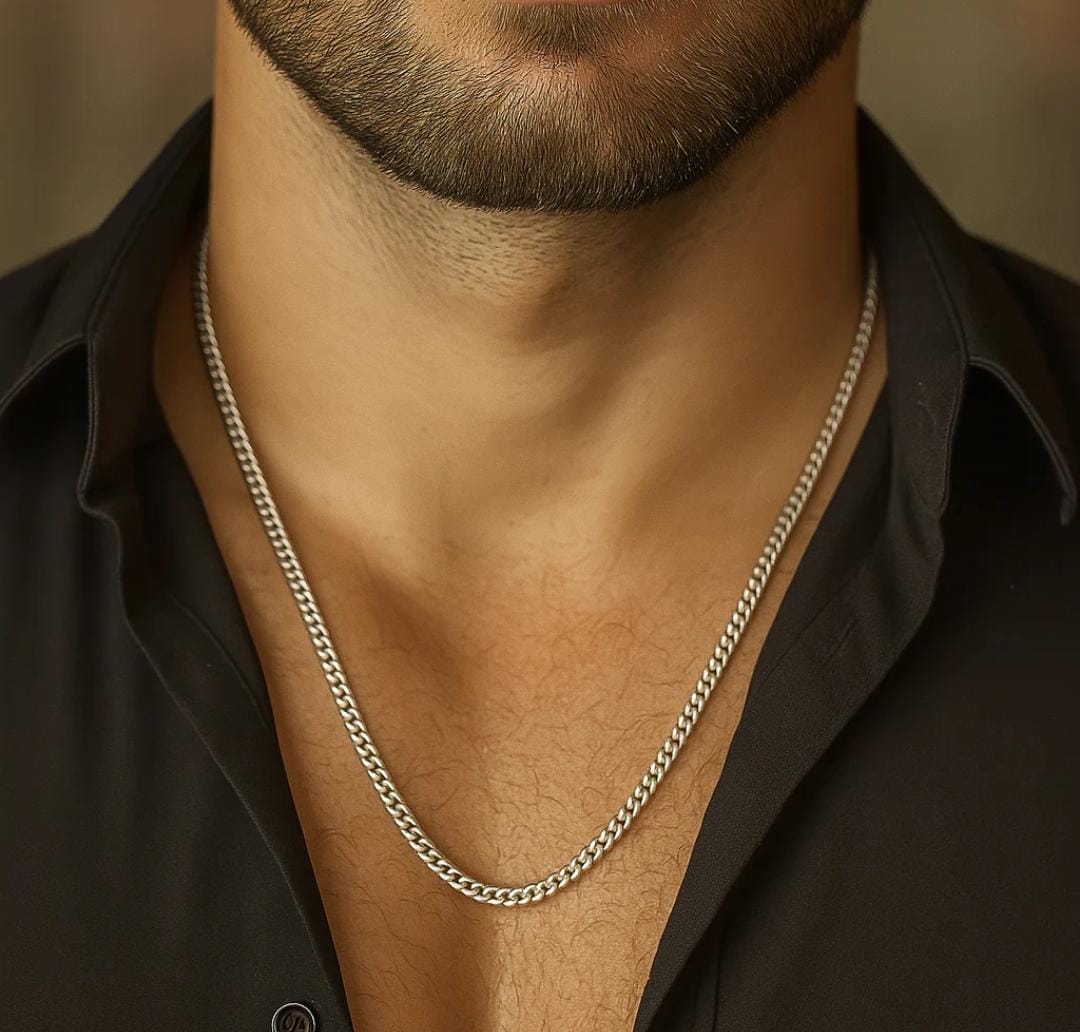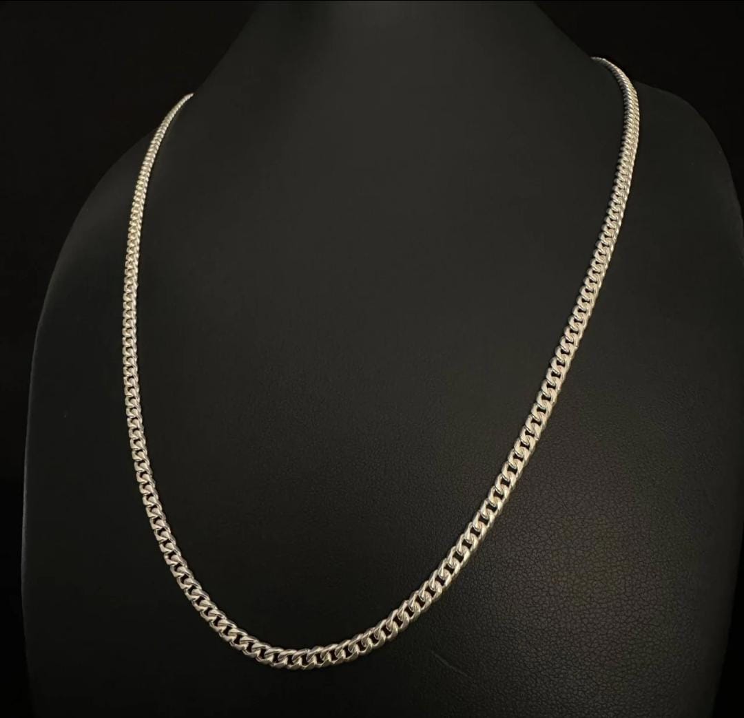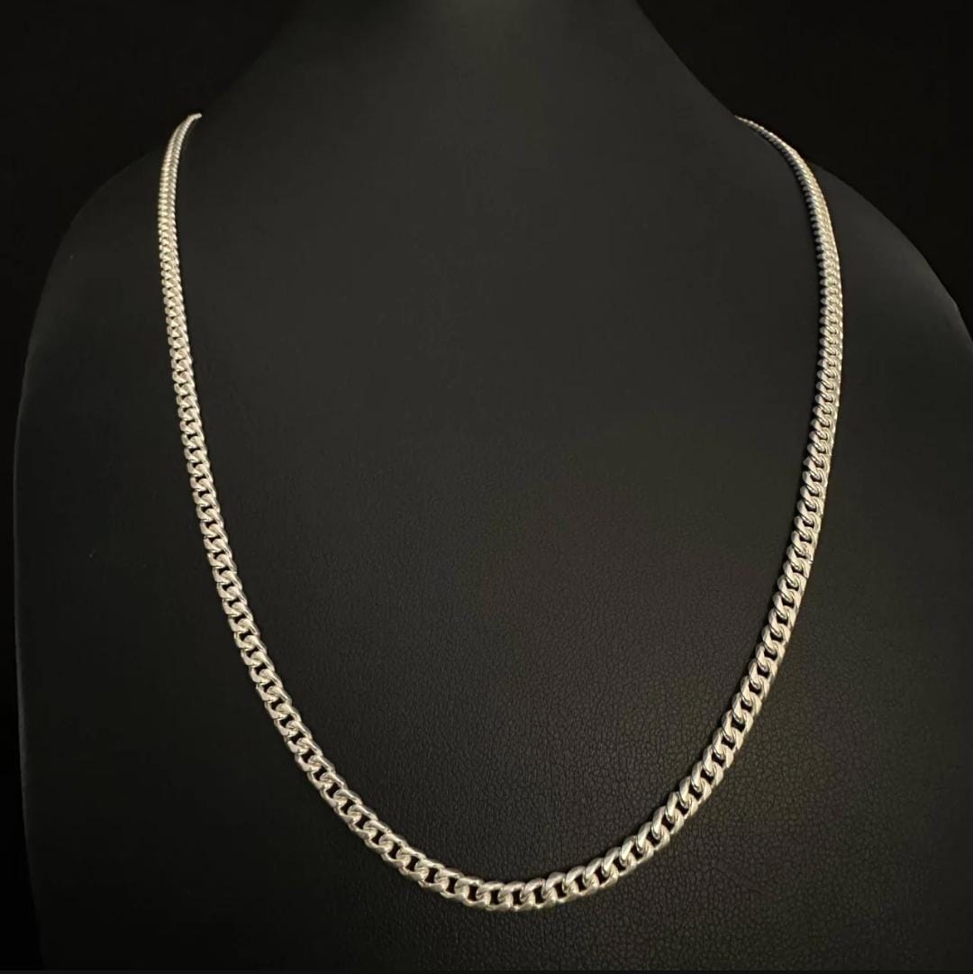 Tiene un grosor de 3 mm y de largo 60 cm. es una cadena que te hace distinguir en cualquier ocasión.
